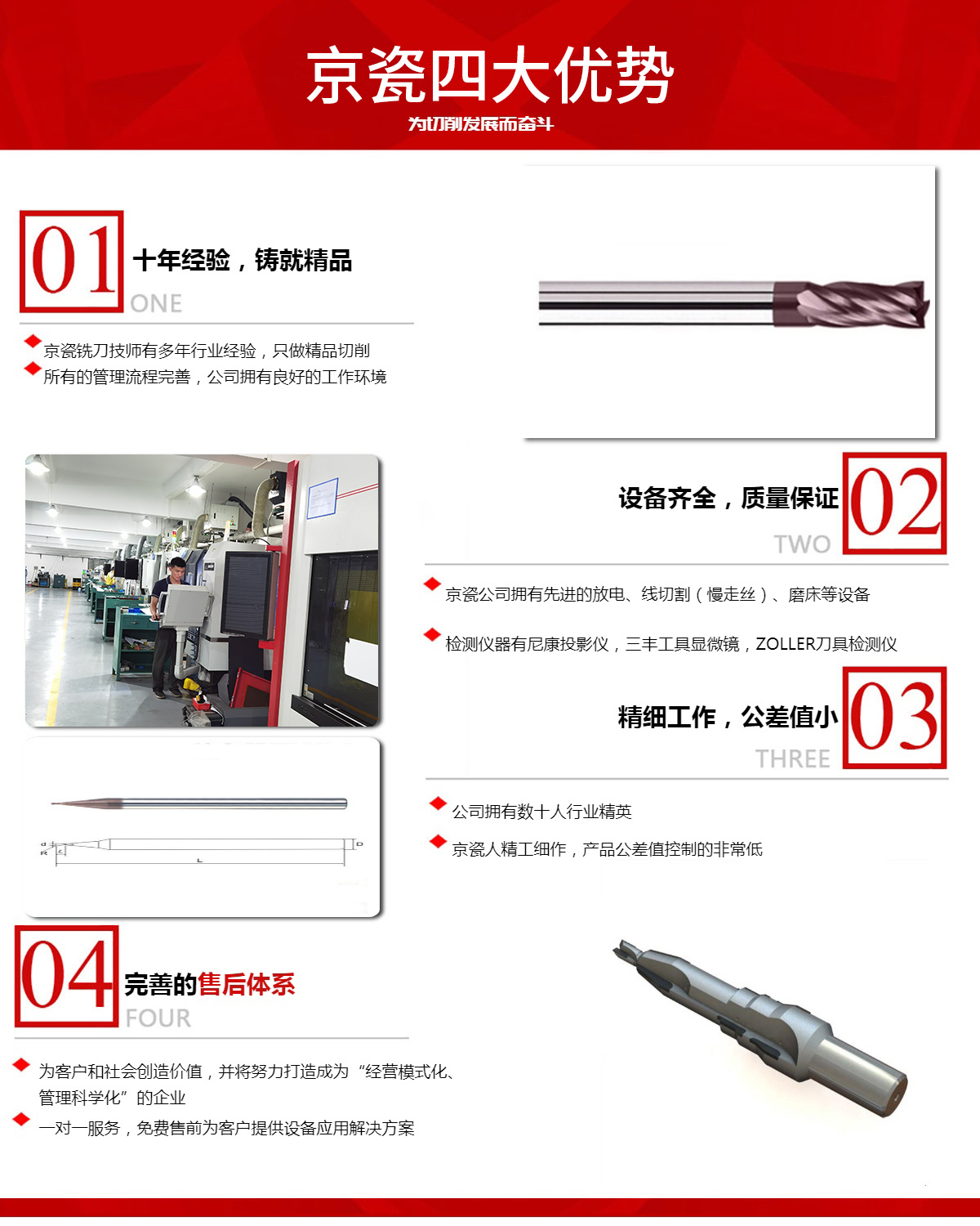 东莞市京瓷精密机械有限公司主要生产硬质合金铣刀、钻头、铰刀等,并可根据客户来图来样非标定制。刀具均采用进口优良材料,经“瓦爾特”进口数控机床制造并使用纳米级涂层技术,所生产的刀具精密度及耐磨度优于同类产品,目前已发展到几大系数十种产品,并代理日本“京瓷”、“三菱”等品牌刀具。客户群体包括:精密机械制造、电机制造、汽车摩托车行业。公司一直秉承“质量至上,服务至上”的理念,竭诚为广大客户提供更优良的服务!